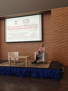 Here's a photo of Michael and his friend, fellow author Christian Kiefer, chatting during an audience Q&A following their joint reading at Summerwords. The goody bags had both their novels in it. Score!