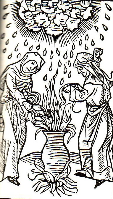 The image is from the 1489 edition of De Lamiis, a book about witchcraft. It shows witches calling down the rain.