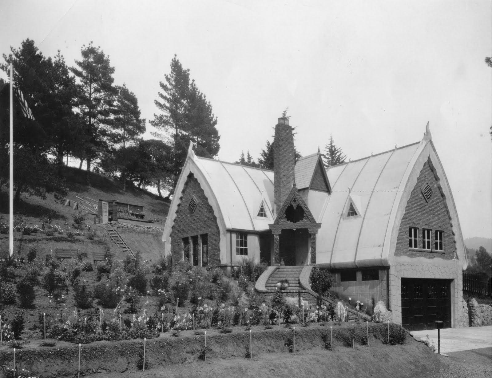 The other structure is the library on Mountain Boulevard. Its roofline was built to look like it was already sagging for centuries, although the library was quite new at the time of this photograph. You can see the clinker brickwork behind the bushes and its general homespun, European appeal.