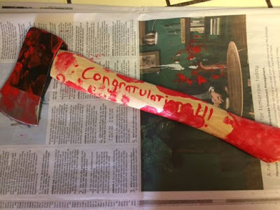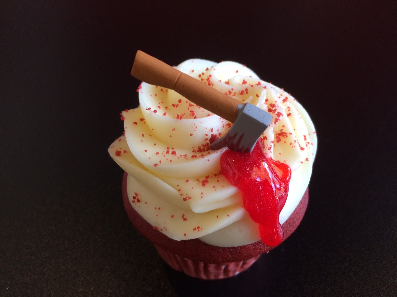 I staged this at the cupcake boutique, enduring quizzical looks. I brought the (edible) hatchet and the squeeze tube of red gel frosting. Delish!