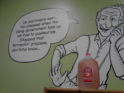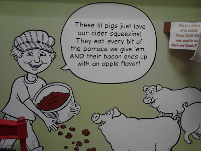 I have to put a word in for the cider doughnuts you can buy nearby at the Cold Hollow Cider Mill donuts. They are fresh off the griddle and so tasty I could almost weep thinking about them right now. The mill also teaches about cider making and has fun wall art like this: