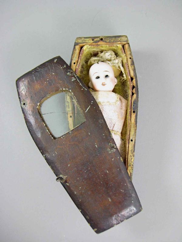 You can still purchase these dolls on ebay or maybe find some buried in your backyard. One more fun element about the dolls; some of them have unglazed backs so that they can float in the bathtub. Apparently people sometimes baked the smaller ones into cakes. Yum, tasty corpse in my red velvet slice! And, true to Victorian sensibilities, some came with their own coffin.