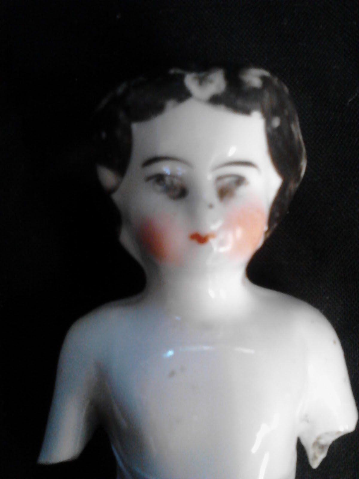 A quick bit of online research reveals that the bisque dolls were called Frozen Charlottes because they were frozen in one piece, without moveable limbs. No fun to dress them! Apparently they became allied with a sad poem and then ballad from the era, "A Corpse Going to a Ball," by Seba Smith. Among other things, Smith coined the word "scrumptious" and wrote the terrible saying, "There's more than one way to skin a cat."