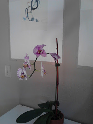 Tale the First. This narrative involves an orchid that was (!!!) $5.99 at my grocery store, and I figured even if it died within days, it would be the same as purchasing a low-cost bouquet. But I brought it home thinking, "If only I could keep it alive..." I googled how, and learned that the orchid requires, get this, "benign neglect." That is so up my alley! I calendared two week increments to soak it in boiled-then-cooled water, then ignore it. I faced it by the eastern window as the internet directed.
