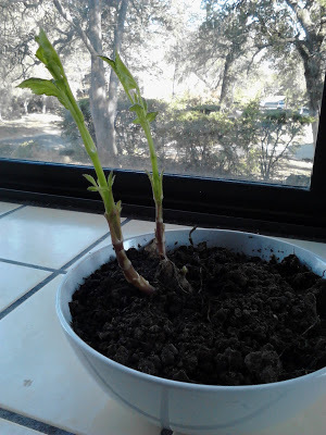 Tale the Second. The same grocery store was offering bulbs in boxes for 25 cents. I figured at these bargain basement prices, the bulbs were already dead, but what the heck. So I planted the dinner plate dahlia in a cracked white cereal bowl and watered it casually when I was in the kitchen and thinking about it. In disbelief, I have watched a green shoot emerge from the brown woody stem, and get bigger each day. I did that. Me.
