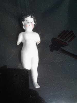 Was this Lizzie's doll?While at the Lizzie Borden Bed & Breakfast, I spied a doll in a glass case behind the cash register in the gift shop. Turns out it was a Frozen Charlotte doll that had been found in a privy excavation along with other shattered bits of crockery and bottles. An employee kindly took it off the wall so I could look at it more closely. Conjecture of course has it as Lizzie Borden's doll since she was the only child living there around the time the dolls were manufactured (1850-1920 or thereabouts).