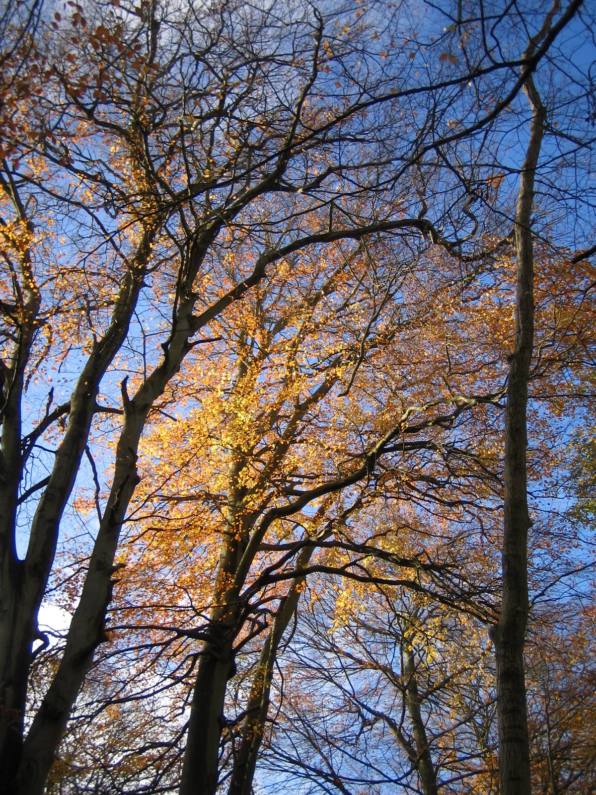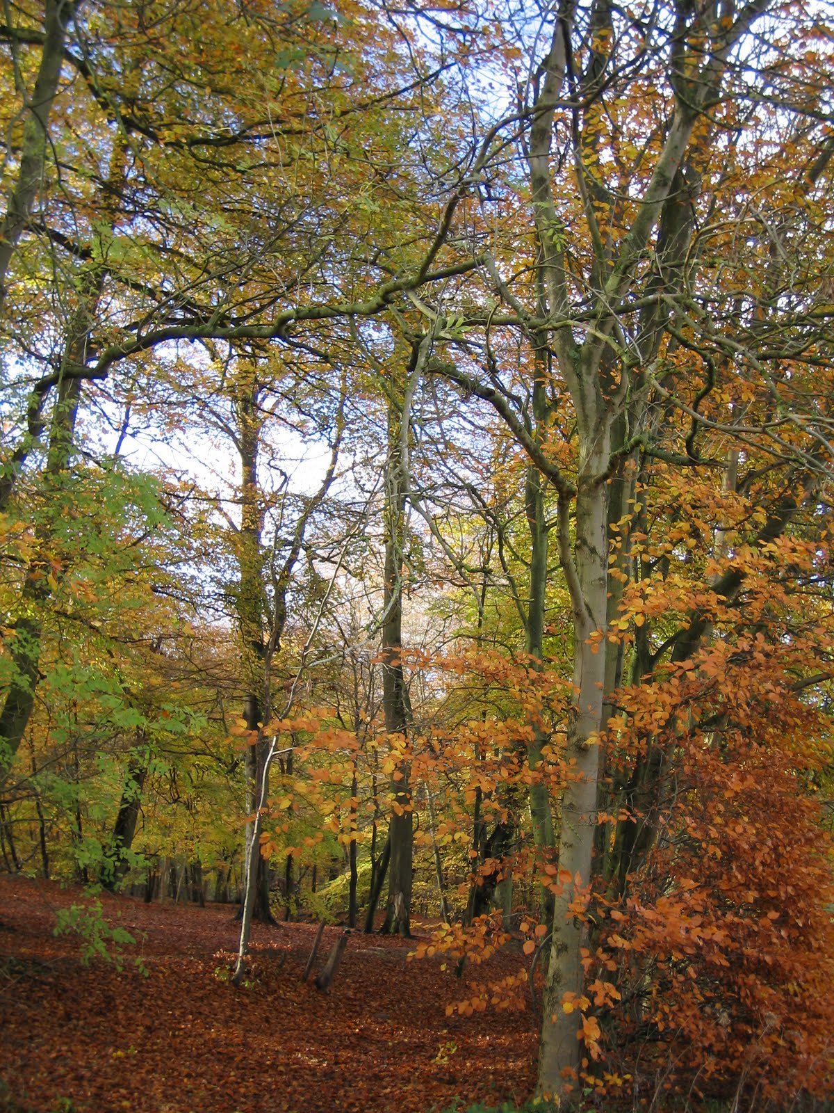 Beautiful beech trees in NovemberThe leaves are almost gone now, and in fact I'm quite surprised there are still any about after last weekend's storms. Beech trees, as pictured above in a wood near me, really are my favourite. It's their variety of colours - from that brilliant impossibly lime green in May through deeper shades of green, then gold, russet, yellow and finally ... nothing. Although they make a thick golden brown carpet all winter.