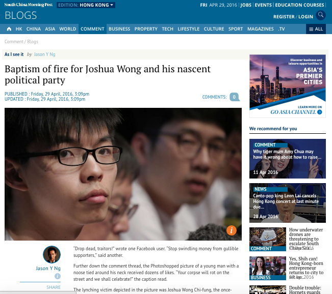 This article appears on SCMP.com under the title "Baptism of fire for Joshua Wong and his nascent political party."