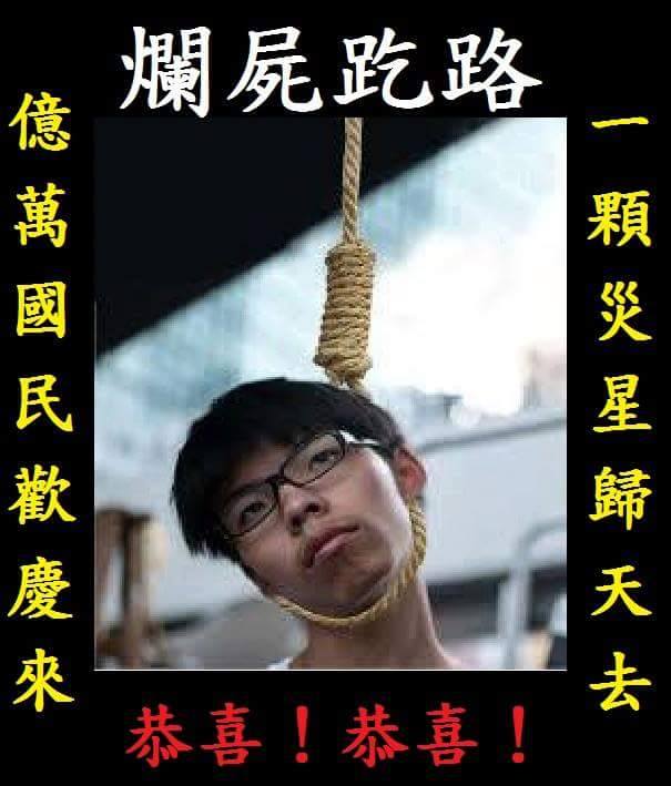 The lynching victim depicted in the picture was Joshua Wong (黃之鋒), the once-idolized student leader who, at the tender age of 14, led tens of thousands of citizens to thwart the government’s attempt to introduce a patriotic education program. The darling of foreign news media appeared on the cover of Time’s Asia edition and was named one of Fortune magazine’s top 10 world leaders in 2015 alongside Pope Francis and Apple CEO Tim Cook. There were even whispers that he should be nominated for a Nobel Peace Prize.