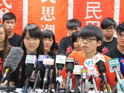 Joshua Wong (in orange) announcing the dissolution of Scholarism___________________________