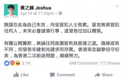 Until recently, the trolling had been one-sided, and the Demosistians had not hit back. Two weeks ago, however, Wong made the mistake of responding to a supporter of Edward Leung (梁天琦), spokesman of Hong Kong Indigenous. The supporter had left a Facebook comment criticizing Demosistö’s $2 million fundraising campaign. Wong defended his solicitation of small online donations with a short reply: “We don’t want to court secret benWong’s regrettable remark was political red meat for the trolls, and the teenager was slaughtered on social media for leveling an unsubstantiated attack against Leung. The next day, Wong issued a public statement on Facebook apologizing for his gaffe. Not surprisingly, the apology was not accepted; it has fired up his critics even more.