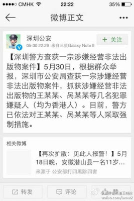 Shenzhen Police sent out a tweet on 30 May 2012 announcing Guo's arrest