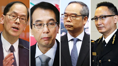 The cabinet reshuttle: (from the left) Tsang, Tang, Lau and CheungAnywhere else in the world, any one of the foregoing events would have caused a public uproar. Having all of them happen in the same week would have sent angry mobs to the streets – vehicles would have been set on fire and government buildings stormed. Lawmakers would have initiated a vote of no confidence to remove the political leader. Not so in Hong Kong. After the initial shock has passed, the news cycle hurtles on. Each headline elicits a dry laugh from citizens and makes them pause for a moment, before everyone returns to whatever it is that they busy themselves with. Hong Kongers now have the memory of a goldfish and the attention span of a hyperactive toddler.
