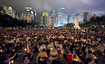 Earlier tonight I attended the candlelight vigil at Victoria Park. With teary eyes and a heavy heart, I put on a black-and-white outfit as if I were going to a dear friend’s funeral. At the park, somber citizens occupied every occupiable space as far as the eye could see. To my left, a young couple held on to their infant fast asleep in the summer’s heat. To my right, a sweaty teenager led two blind men negotiating the crowds with their walking sticks. Every one of us chanted pro-democracy slogans and strained to hear impassioned speeches drowned out by the chorus of cicadas singing loudly in the trees. Twenty years ago, demonstrators besieged Tiananmen Square to demand the vindication of ousted party chief Hu Yaobang (胡耀邦). Twenty years later, I found myself among 150,000 sitting in a peaceful protest demanding the vindication of those very demonstrators. Despite Hong Kong’s many foibles and political anomalies, tonight our city was the collective conscience of the 1.3 billion Chinese people around the globe and a beacon of hope for a better China. I had never been more proud of being a part of this city.