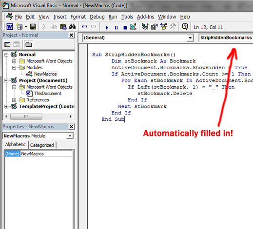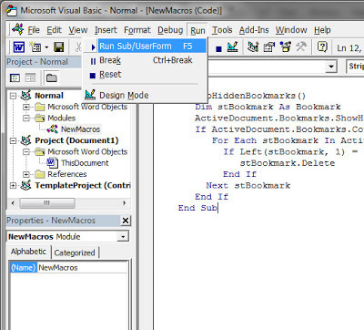 As you can guess, there is a way to run a Macro to remove all "Hidden" bookmarks in one click. In fact, the Microsoft Office support page at http://support.microsoft.com/kb/184041 has free code to do it for you. I've used it and can attest that works just great. All you have to do is get it into your document and "run" it. That's where many of you might not know what to do and what I'll cover in the rest of this Tuesday Tip (after the code snippet).