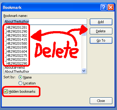 In Step 20d of the Smashwords Style Guide, Mark explains how to remove the "Hidden" bookmarks prior to submitting your Word document for conversion into an eBook by doing it one at a time--the hard way. I'm going to explain to you an easier way. Even if it seems a little daunting at first, trust me, automation is easier than thelong, drawn out tedious process of selecting one "Hidden" bookmark at a time and clicking delete for each and every one of them. You may have 100 or more of these buggers hiding in your document!