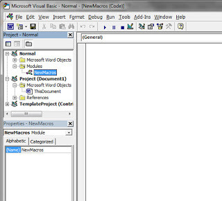 Highlight the code shown above (only the preformatted text, not the heading) and paste it into the empty Visual Basic Editor window (the one in the screen shot with "(General)" above it). Now your screen should look like this:
