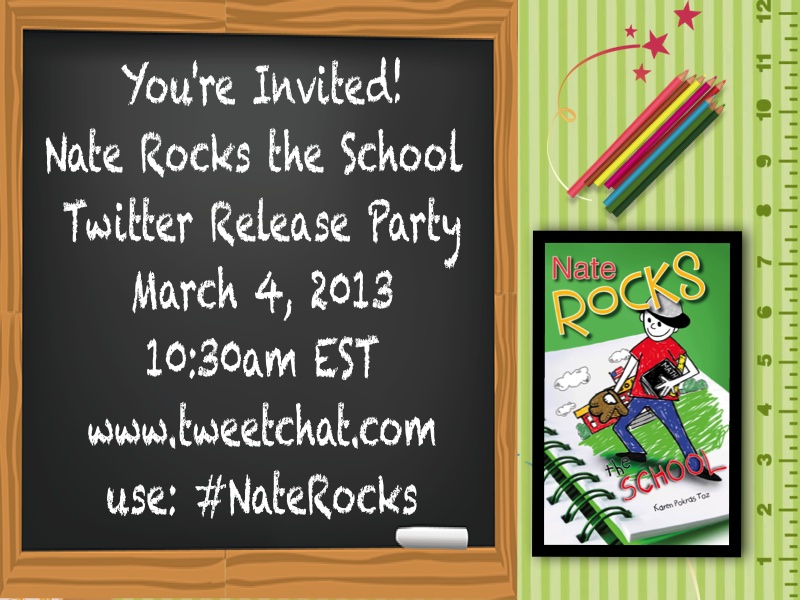 Chat with Karen Pokras Toz today at 10:30 am EST and then follow the Nate Rocks the School Tour for appearances by the author and characters, reviews, and swag pack giveaways!