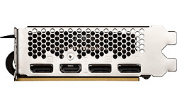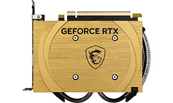 This model does not have a shroud, but uses a cooling solution that looks somewhat like a stock cooler from Intel or AMD CPUs. An important difference is that heat pipes come from the largest cooling block, which in turn are equipped with additional heat sinks. Unlike the latest Cyclone cards, MSI has opted for gold-colored accents instead of black or gray. The backplate also has a brushed gold appearance.