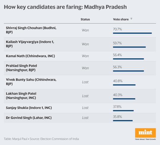 In Madhya Pradesh, chief minister Shivraj Singh Chouhan was comfortably leading from the Budhni constituency. The BJP leader received more than three-quarters of the votes as of 11.30 am. In Rajasthan, senior Congress leaders Sachin Pilot and Ashok Gehlot were leading in their respective seats by polling more than 50% votes each. BJP leader and former chief minister Vasundhara Raje was ahead in the Jhalrapatan seat by polling over 60% of the votes.