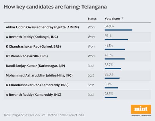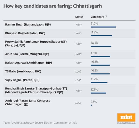 In Chhattisgarh’s Patan constituency, BJP’s Vijay Baghel and Congress’ Bhupesh Bhagel were neck and neck with 48.7% and 46.5% of the votes as of 11.30 am. In Ambikapur, Congress’ TS Singh Deo was leading with 46% of the total votes. In Telangana, chief minister K. Chandrashekar Rao, who is contesting from two assembly seats, was leading on one seat, Gajwel, and trailing on the other, Kamareddy.