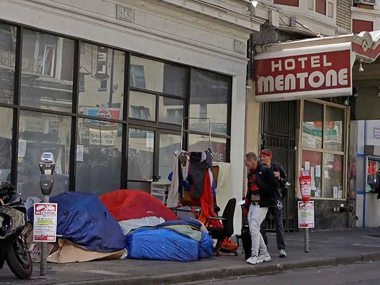 Pedestrians walk along the edge of a sidewalk to avoid tents and sleeping bags, on April 13, 2020, in the tenderloin area of San Francisco. Ben Margot/AP