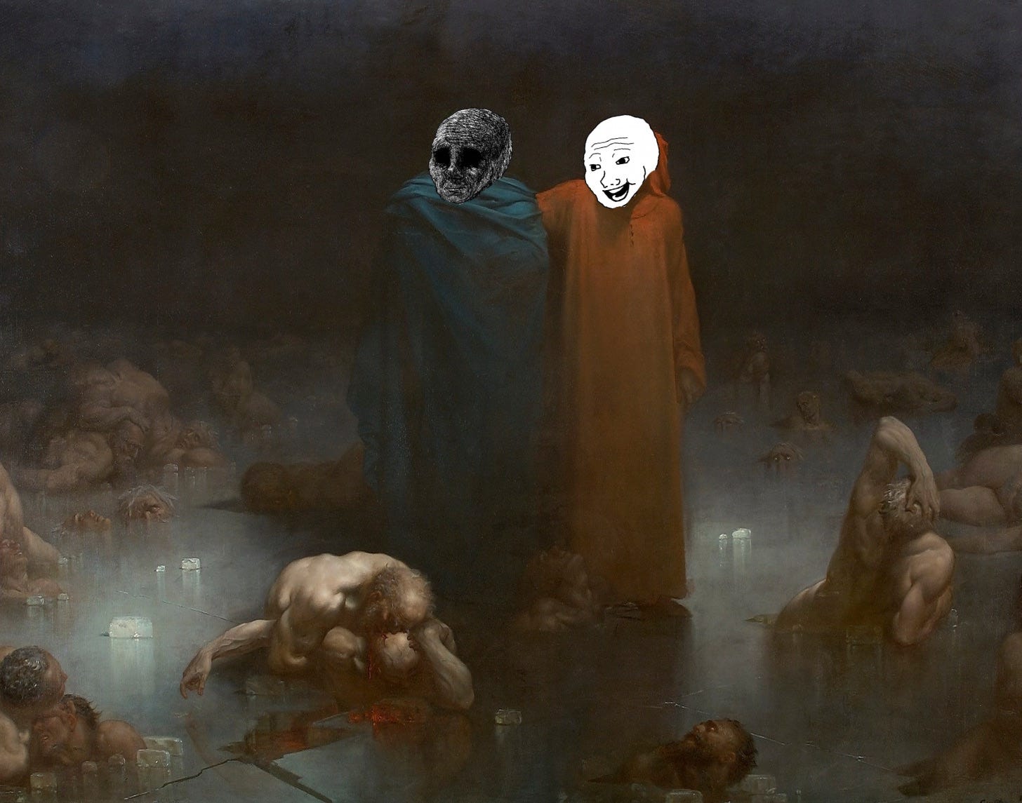 Probably Gustave Doré, Wojaks at the Global Death OrgyAny word, thought the ancient man, is like a spell—say it right and you'll bewitch, heal, curse, or worse yet, without any ulterior motive, with just one word you'll turn the world arse over tit like with a nuclear bomb. Boom! Bang! Ba-bam! Right then, you're fucked, cunts, thought the ancient man of those around him, and became a spell-caster.