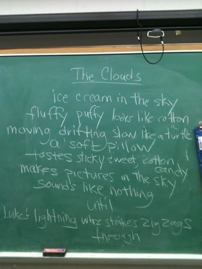 Yesterday I visited my daughter's class at school to teach writing. I'm going in for a few mornings this spring to do fun stuff and try to inspire the kids. We worked on description together: brainstorming, dreaming, getting our heads chock full of sensory details like sight, sound, smell, taste, and touch. We listened to music; ate chocolate kisses. The kids were so smart! Everything we described together turned into a poem.