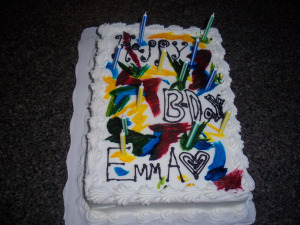Last Friday was my daughter Emma’stwelfthbirthday. Saxon took the day off work so we could celebrate as a family. The day began by eating birthday cake for breakfast. Emma designed the cake herself. She took a photo of one of her paintings (our house is decorated in Emma’s cool artwork) and Walmart duplicated it onto a cake. It was not only beautiful but it tasted good, too. After the cake we inhaled helium from balloons and sang “Sweet Home, Alabama.”