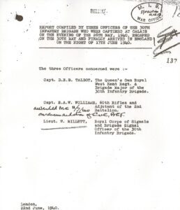 I am Dennis Talbot’s eldest son. My father also received the MC for Calais but no citation can be found. He and Alick Williams remained friends until their deaths after the 50th anniversary of ‘The Last stand at Calais’. I have a photo of them together at our home ‘50 years on’. The famous ‘dodgy’ compass is in the Queen’s Own Royal West Kent Museum in Maidstone. Among my father’s papers I recently found a POW postcard from Nicholson in response to a letter from my father. I have been in touch with Nicholson’s son Richard who holds the famous painting ‘Last stand at Calais’. I have also recently been reading the recent Pardoe and Jay Calais POW books both of which give a very good picture of what would have happened to Talbot, Williams and Millet if they had not jumped the column as it stopped heading south (towards the French) and turned east towards Germany.