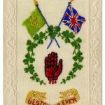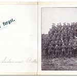 The front of the card shows the Battalion crest comprising a scroll with the Battalion name, a Tudor crown over the winged-maiden Irish harp, the Regimental motto Quis Separabit [Who shall separate (us)?], the bugle associated with rifle regiments and light infantry, and the descriptor ‘Pioneers’, the role of the Battalion. The interior had space for a photograph (in this case No. 2 Company). The card is tied with a black and green ribbon, the colours traditionally associated with rifle regiments.