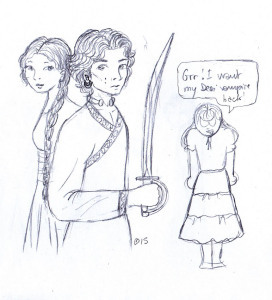 I did this Tuesday morning. All from memory, especially the clothes. Kaylyn is supposed to wear a 12th century bliaut. And I couldn’t remember how Rajputs dressed. So… pencil sketch from memory! With spoiler… sort of! ;)