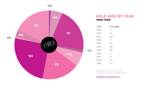Because I’m a self confessed Hole and data nerd, I made this graph showing Hole gigs by year. In 1995, they played 96 gigs which turns out to be an average of a gig every 3.8 days! Definitely their biggest & best touring year off the back of Live Through This.