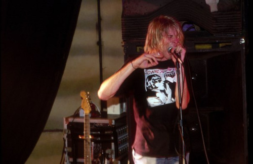“I was on the side of the stage for all of this gig and was pretty impressed with the bands performance that evening but apparently they were less so. So much less so that in a fit of rage they spontaneously decided to trash all their gear onstage. Later that night, Krist Novoselic shaved his head in an act of penance.” - Photographer: Steve Double.