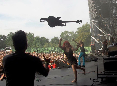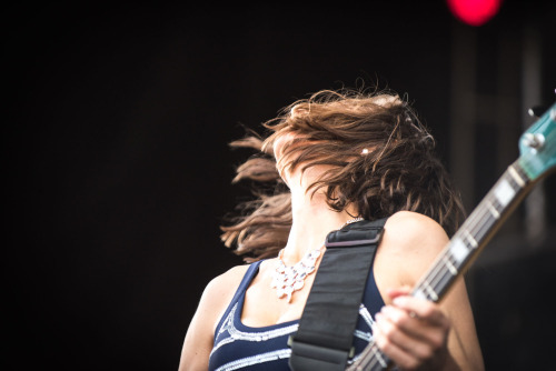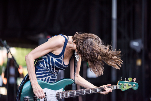 “Photo by Aubree Elizabeth Corliss Miller great timing lady! Throwing the bass to long time friend Joe O'Neill on the last note of the L7 Reunion Tour.” (x)