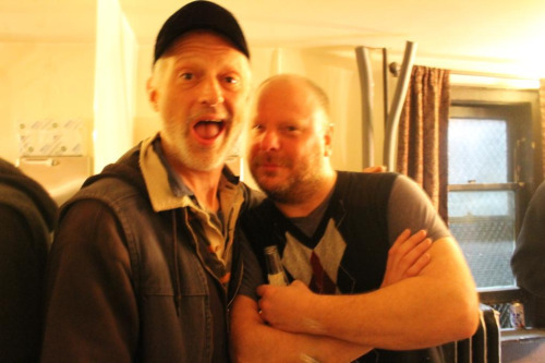 Former Mudhoney bassist Matt Lukin with his old bandmate Dan Peters, backstage at last night’s Sonics/Mudhoney show in Seattle.