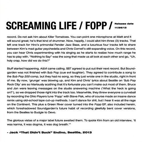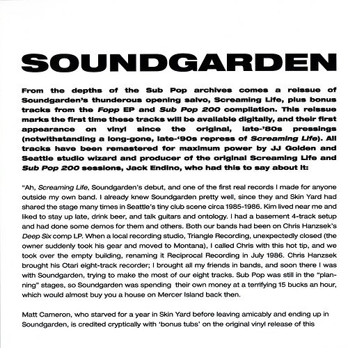 Look what came in the mail today: an advance copy of the Soundgarden Screaming Life/Fopp reissue from Sub Pop. The promo booklet features words from producer Jack Endino.