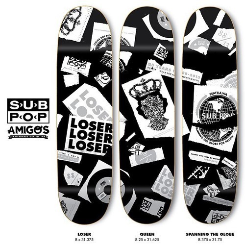 Great for a wall or a wall ride, #SubPop collaborated @AmigosSkateboards on a set of decks commemorating our 25th year. Hand-numbered and limited to 40 each, they’re available individually for $35 or as a set for $100. #amigosskateboards http://www.subpop.com/catalog/artists/sub_pop (at Sub Pop HQ)