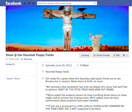 What if there were Facebook event pages for famous music videos? I really love this post by Sarah Kasulke.