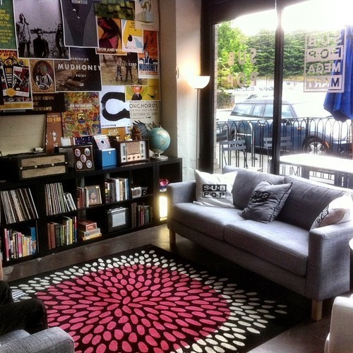 The chill out room at the new (and temporary) Sub Pop Megamart. Come down to Georgetown, play a record in the chill out room, check out all of the new and very limited-edition merch, the archival art gallery, and the general good times.