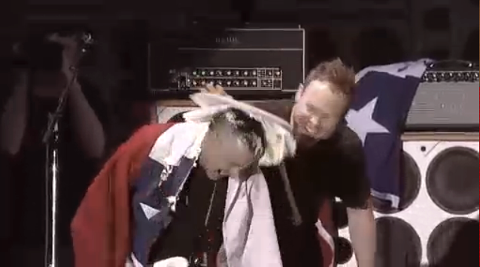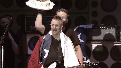 Pearl Jam’s Mike McCready gets the ol’ cake-on-the-head treatment at Lollapalooza Chile on Saturday.