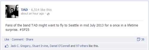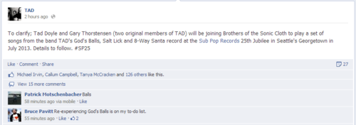 So the TAD reunion is just a sorta reunion:To clarify; Tad Doyle and Gary Thorstensen (two original members of TAD) will be joining Brothers of the Sonic Cloth to play a set of songs from the band TAD’sGod’s Balls,Salt Lickand8-Way Santarecord at the Sub Pop Records 25th Jubilee in Seattle’s Georgetown in July 2013. Details to follow. #SP25