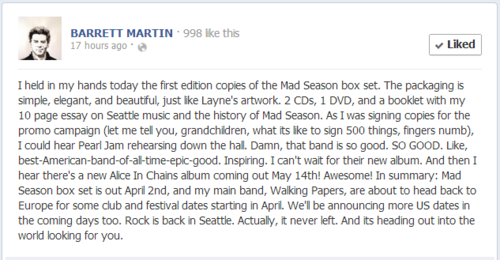 Facebook update from former Mad Season/Screaming Trees drummer...
