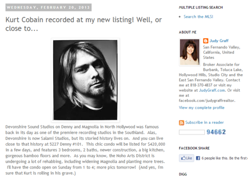 Tacky San Fernando Valley real-estate broker sells condo based on highly tenuous Kurt Cobain link. Here’s Ms. Graff’s comment under theNorth Hollywood Toluca Lake Patchstory that initially reported her sales pitch: “Um, Judy Graff here. The condo sold in less than a day for over full price. Thanks, Kurt.”