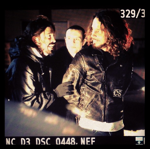 So not only is Dave GrohldirectingSoundgarden’s video for “By Crooked Steps,” but deadmau5 also has asweet cameoas a cop arresting Chris Cornell. Photo taken last night on set by Kat Von D.