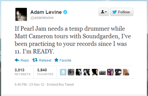 Tweet from Maroon 5 frontman Adam Levine, which he followed up with this: “1. I’m dead serious. 2. I’m DEAD serious.” (H/T Capital FM)