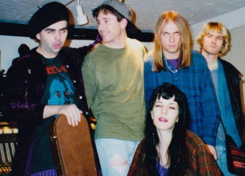 The Melvins with engineer Jonathan Burnside (second from left) and Kurt Cobain, during the sessions for the Melvins' major-label debut Houdini. Cobain is credited as a producer on the album.
