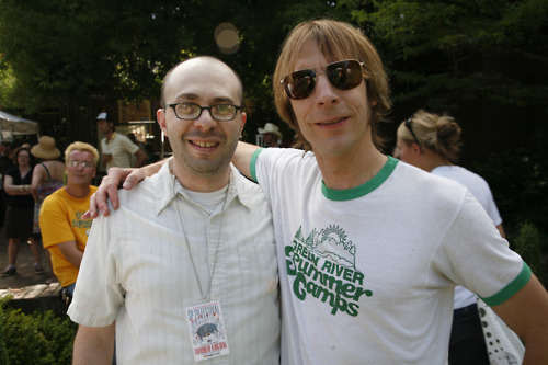 I'm not big on getting my photo taken with the people I interview, but this one needed to happen for the title alone: Yarm and Arm, Arm in Arm. Photo snapped by Mark's wife Emily at the Sub Pop 20 fest, July 2008. (Note: That's Green River drummer Alex Shumway photobombing us.)