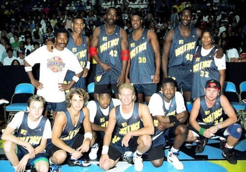 Pearl Jam bassist Jeff Ament (front row, far right) and other luminaries at the 1992 MTV Rock N' Jock basketball game. (Source: Jeff Ament's Army)
