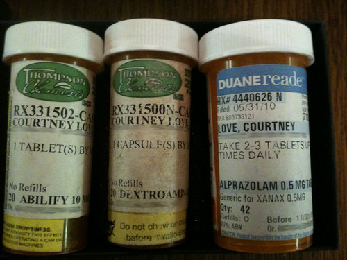 Artists Katie Heffelfinger and Jed Miner created a found art sculpture out of 57 discarded pill bottles prescribed to Courtney Love. The pair of artists, who call themselves "occupytheartworld" found the bottles in a "common area" at a storage facility. Click HERE to see photos of the artwork.